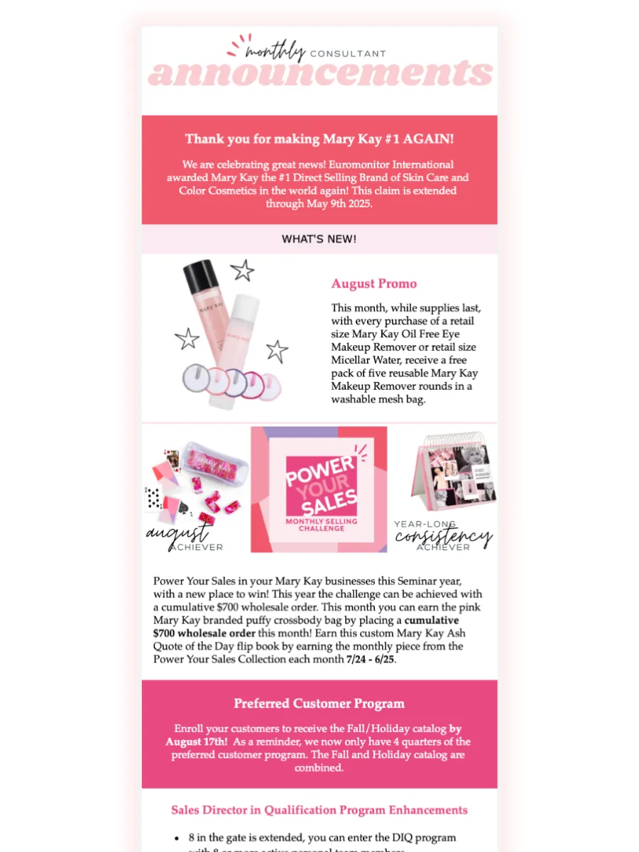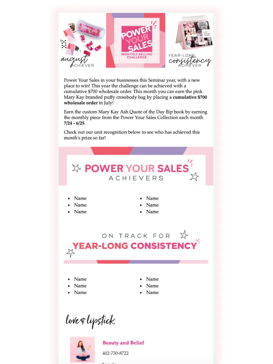 This template is used to inform your Consultants about the company's promotions this month. You can edit it to add anything you would like to include for your Consultants. There is a place at the bottom of the template to put additional prizes you may be running and an additional message from you. If you do not want to add either of these things, you can easily delete those sections out. The button below provides you with a video tutorial if you need it.