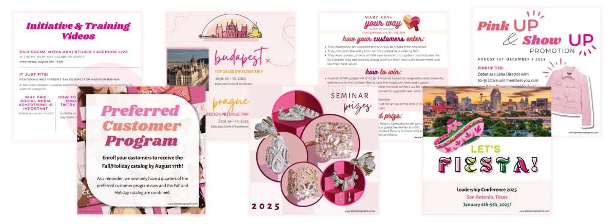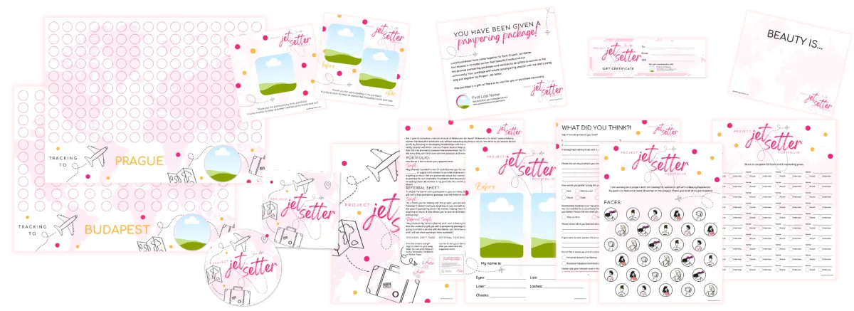 This template can be used on its own, or along with the coordinating tools we have in our Graphics Gallery, if you have a Graphics Gallery membership. We have created a portfolio, referral sheet + closing questions, pampering package texting image, project sticker in circle and square formats, a before and after posting template, a makeover sign and a gift certificate. We also have the Director's trip tracking posters for both Budapest and Prague!